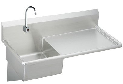 ##14 gauge, type 304 (18-8) stainless steel service sink with right hand 30' (762mm) drainboard. 1/4' (6mm) radius vertical and horizontal coved corners. 1-1/2' (38mm) rolled rim. Full length backsplash with 45 sloped top. Exposed surfaces are hand blended to a uniform satin luster finish. Furnished with wall hanger and stainless steel support brackets. Carries NSF International Certification. FAUCET: LK722B Sensor-operated, non-mixing (tempered water), backsplash-mounted gooseneck faucet with adjustable sensor eyes. A continuous beam is emitted from sensor. The sensor faucet is activated by user placing hands under the spout. Tempered water will flow as long as hands remain within sensor range. When hands are removed, the water stops automatical