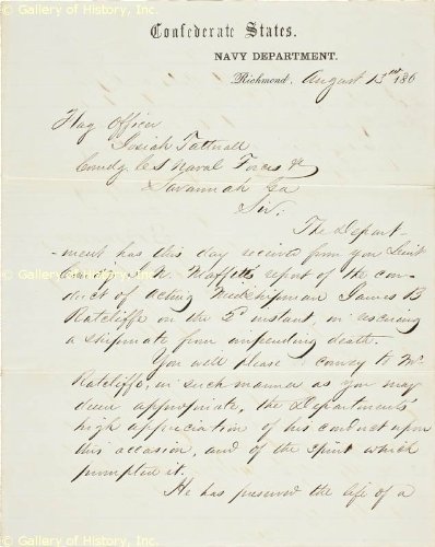 STEPHEN R. MALLORY - MANUSCRIPT LETTER SIGNED 08/13/1861 . STEPHEN R. MALLORY Signed Manuscript Letter commending a Confederate midshipman who rescued a shipmate (1861). Manuscript Letter signed: S R Mallory" as Confederate Secretary of the Navy, 2 pages, 7¾x9¾ (front and verso) with additional page with date and filing information. Confederate States Navy Department, Richmond, Virginia, 1861 August 13. To Flag Officer Josiah Tatnall, Commanding CS Naval Forces, Savannah. In full: "The Department has this day received from you the Lieut. Commanding I. N. Moffitt's report of the conduct of Acting Midshipman James B. Ratcliffe on the 2nd instant, in rescuing a shipmate from impending death. You will please convey to Mr. Ratcliffe, in such manner as you may deem appropriate, the Department's high appreciation of his conduct upon this occasion, and of the spirit which prompted it. He has preserved the life of a Citizen of the Confederate States at the peril of his own; and an act so grateful to the country and honorable to the service of which he is an officer, will not be forgotten by this Department. I am respectfully your obedient servant". Stephen R. Mallory (1813-1873) was the Secretary of the Navy of the Confederate States of America from March 4, 1861-May 4, 1865. Mallory, who had been born in Trinidad and settled in Key West at the age of eight, was a former U.S. Senator from Florida (1851-1861) who had resigned after Florida seceded from the Union on January 10, 1861. When he assumed his post in Jefferson Davis' Cabinet, Mallory was the head of a naval department that had few ships and was in dire need of equipment and personnel. Although the North abandoned the Norfolk Navy Yard with 11 ships, Mallory knew the South could never catch up to the Union fleet. Mallory suggested ironclads as additions to the small Confederate Navy, and went to England in 1862 to help develop a new cruiser. Mallory, the only... For more information contact HistoryForSale. DOCUMENT 283744