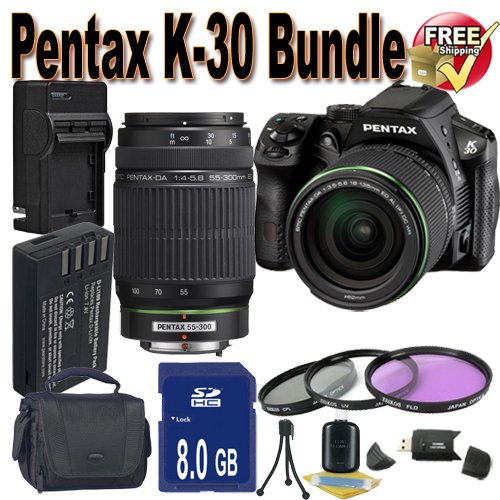 Pentax K-30 Digital Camera with 18-135mm WR and 55-300mm AL Lens Kit + 8GB SDHC Class 10 Memory Card + Extended Life Battery + External Rapid Travel Quick-Charger + USB Card Reader + Memory Card Wallet + Shock Proof Deluxe Case + 3 Piece Professional Filter Kit + Accessory Saver Bundle!?This Kit Includes! 1- Pentax K-30 Digital Camera with 18-135mm WR and 55-300mm AL Lens Kit w/ All Supplied Accessories